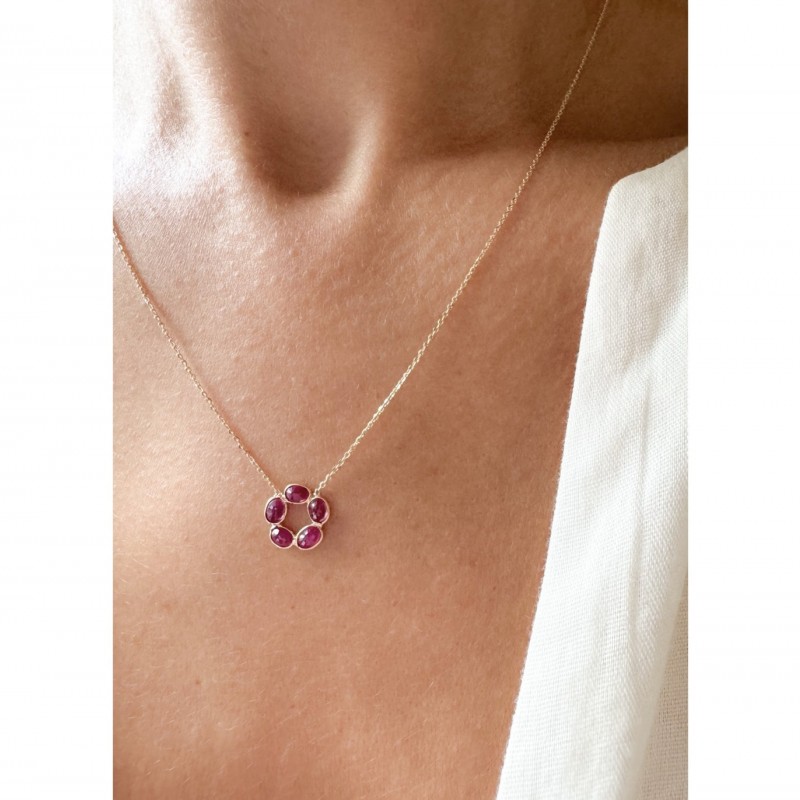 Diese einzigartige Rubin-Halskette ist aus 18 Karat Gold und mit Rubin-Steinen verziert.