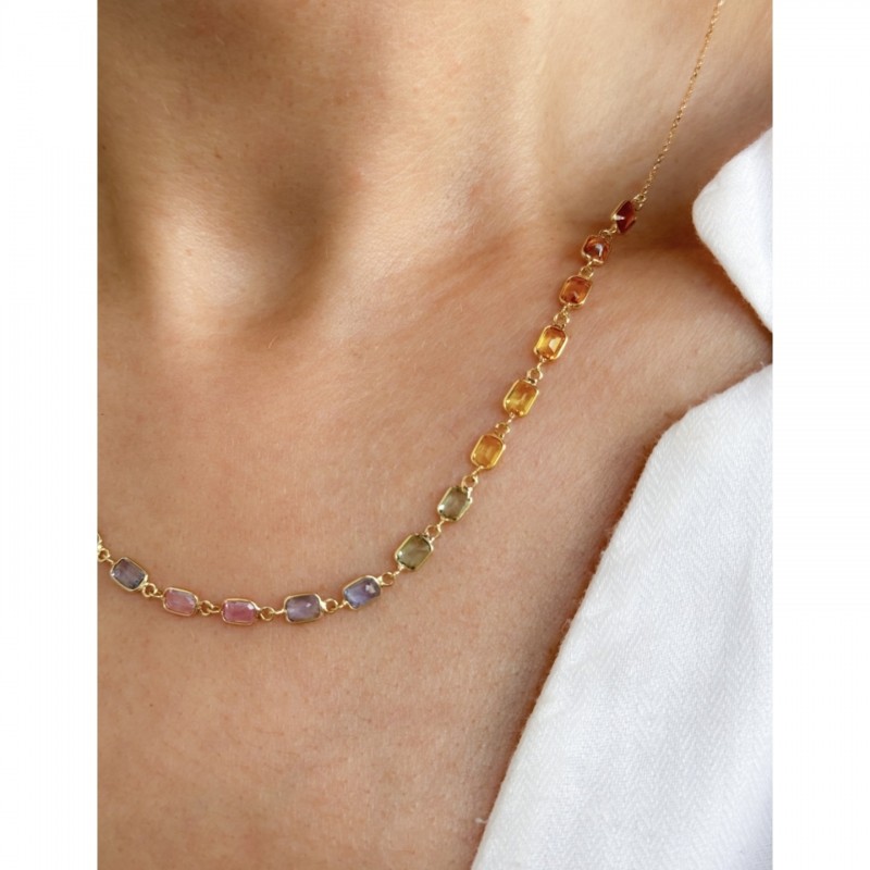 Diese zarte Halskette besteht aus 18-karätigem Gold und einer wunderschönen Reihe von Saphiren in verschiedenen Farbtönen. Die Farben erinnern an einen Regenbogen, wodurch sie ein vielseitiges und auffälliges Schmuckstück ist. Ihr einzigartiges Design verleiht jedem Outfit eine elegante Note.