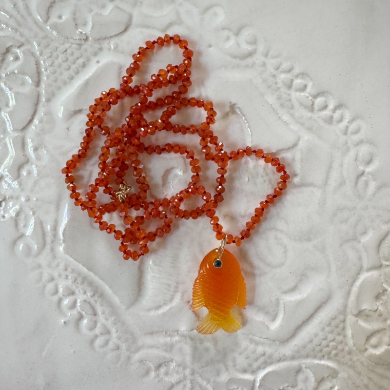 Der Fischanhänger besteht aus geschliffenem Karneol-Chalcedon-Stein. Diese Steinfarbe ist sehr selten. Die Augen des Fisches sind mit Topas-Steinen besetzt. Die Goldteile bestehen aus 14 carat gold. Maße des Fisches: 30 mm x 20 mm