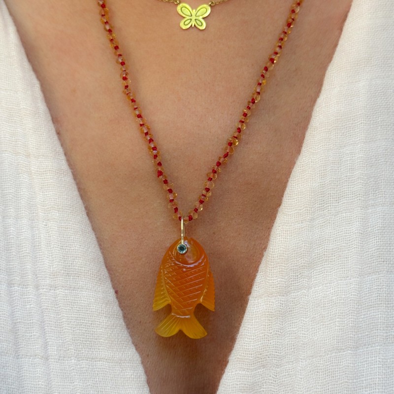 Der Fischanhänger besteht aus geschliffenem Karneol-Chalcedon-Stein. Diese Steinfarbe ist sehr selten. Die Augen des Fisches sind mit Topas-Steinen besetzt. Die Goldteile bestehen aus 14 carat gold. Maße des Fisches: 30 mm x 20 mm