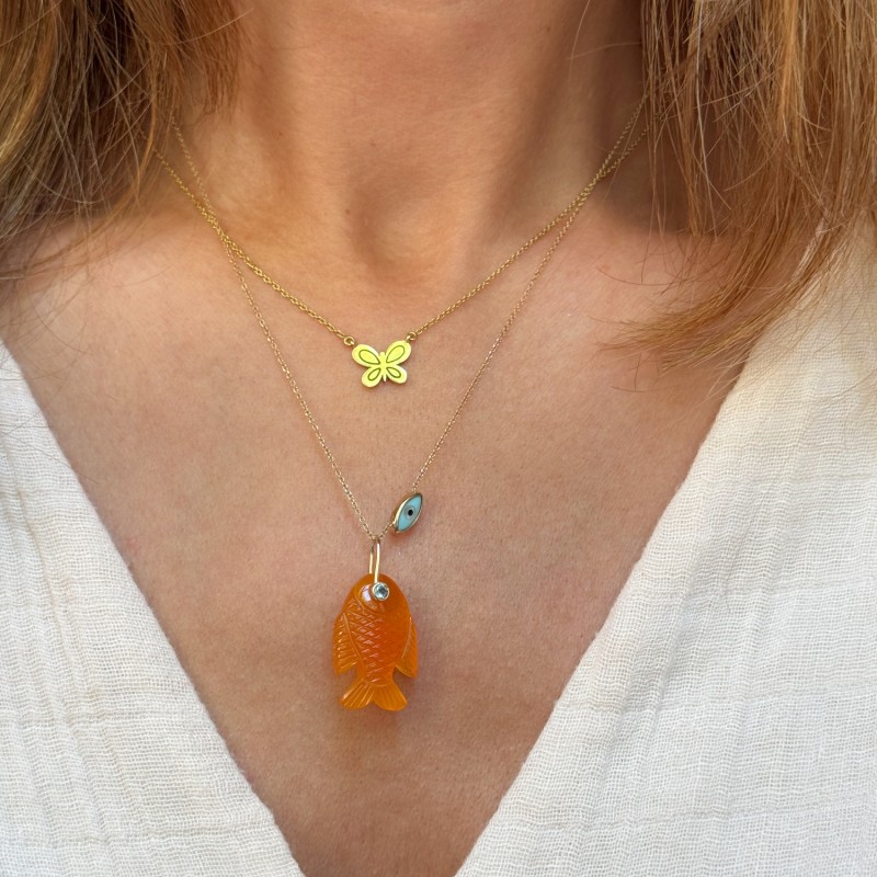 Der Fischanhänger besteht aus geschliffenem Karneol-Chalcedon-Stein. Diese Steinfarbe ist sehr selten. Die Augen des Fisches sind mit Topas-Steinen besetzt. Die Goldteile bestehen aus 14 carat gold. Maße des Fisches: 20 mm x 15 mm. Die Kette ist mit einem 10 karat gold Evil-Eye Enamel verziert.