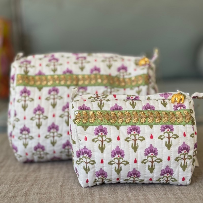 Diese zwei kosmetische Taschen sind aus hübschem Baumwollstoff mit floralem Design. Sie haben goldene Elefantenschmuckstücke, die von den Reißverschlüssen hängen, und sind in zwei Größen erhältlich. Der Stoff hat ein dekoratives Band, das mit grünen und goldenen Details akzentuiert ist.