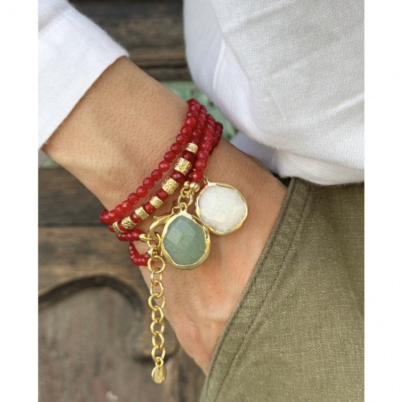 Material: Red jade beads, 24 carat gold plated brass. White jade and aventurine stones as pendants.