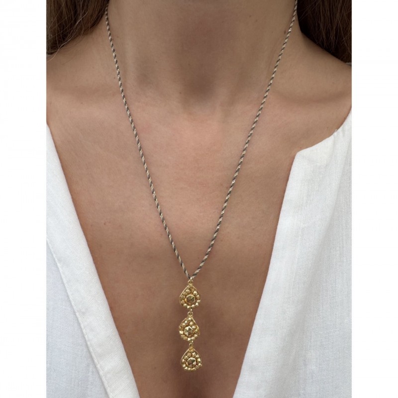 Material: 18 carat gold plated brass. Beige woven silk thread.