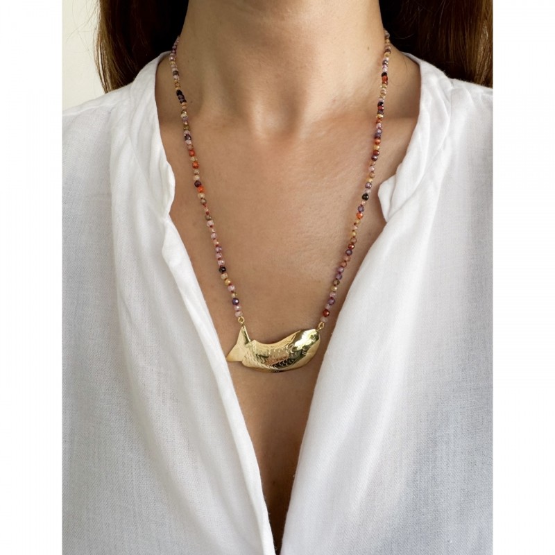 Necklace adorned with a fish pendant and beautiful zirconia beads.