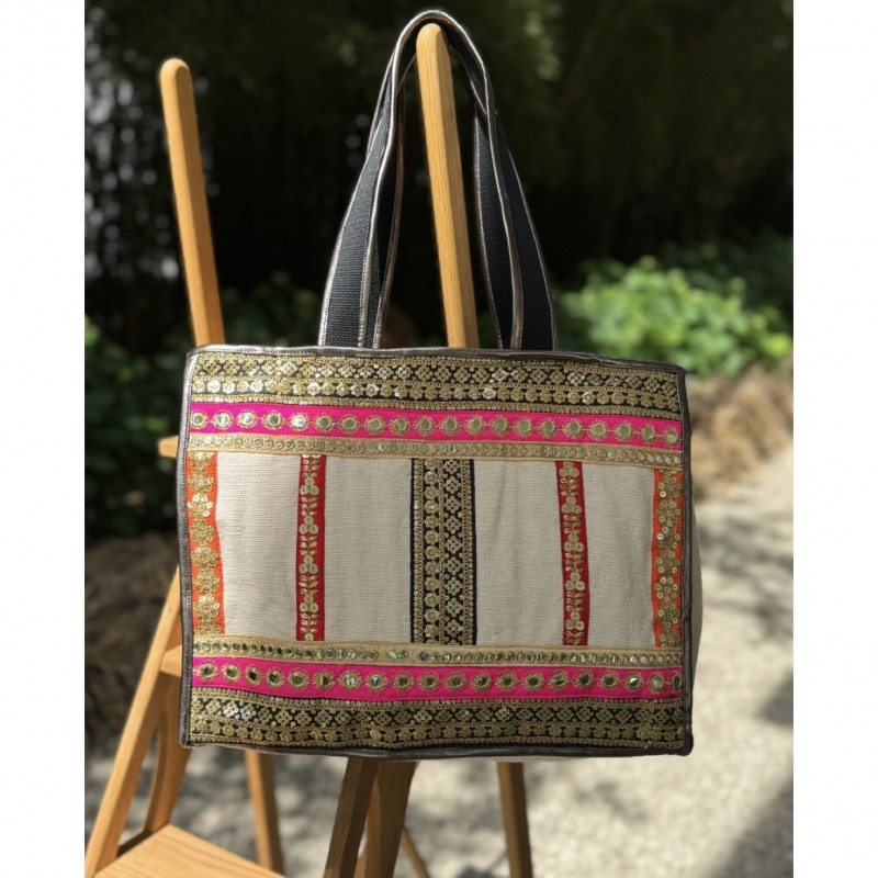Farah bags, like the one shown, are indeed uniquely handcrafted, featuring vibrant colors and eye-catching designs. Each piece is adorned with vintage bands selected by Sara Lashay, sourced from old markets in India. This makes them a special and standout addition to any collection, suitable for both beach outings and city adventures.