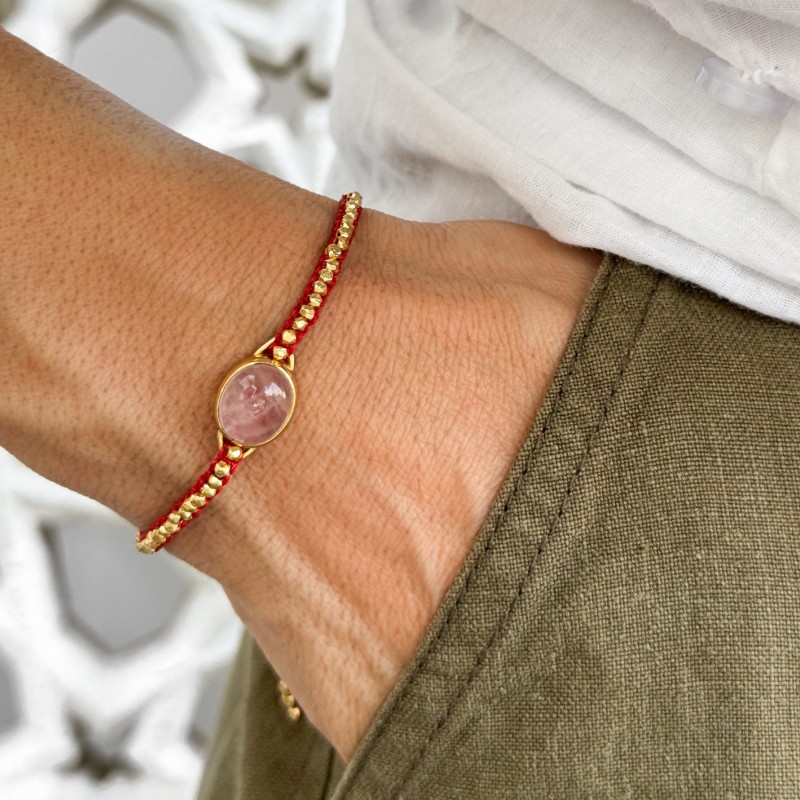Material: 18 carat gold plated brass,  Hand made braided red cotton thread. Rose quartz stone in the center.