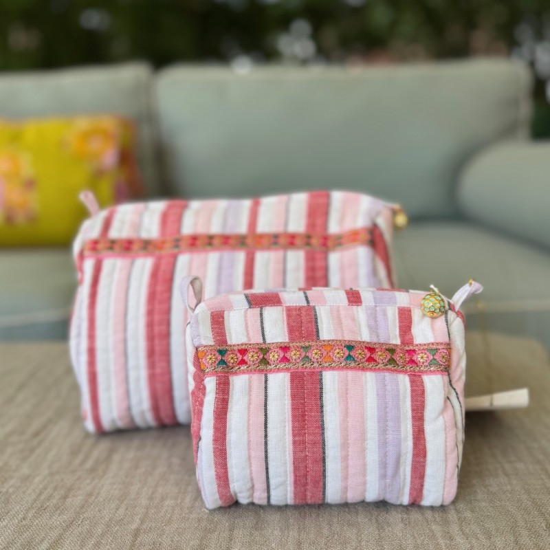 These are stylish cosmetic pouches with red and pink stripes. They have a charming embellishment on the zipper and come in two sizes.