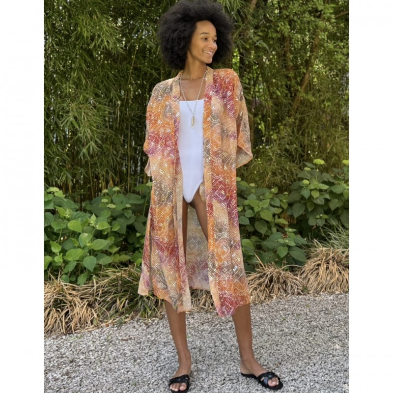 The Sara Lashay kimono is the ultimate statement piece for any beach lover looking to add a touch of glamour to their look. Its unique fabric features exquisite all-over embroidery, beautifully adorned with tiny sequins that catch the sunlight and create an eye-catching shimmer.
