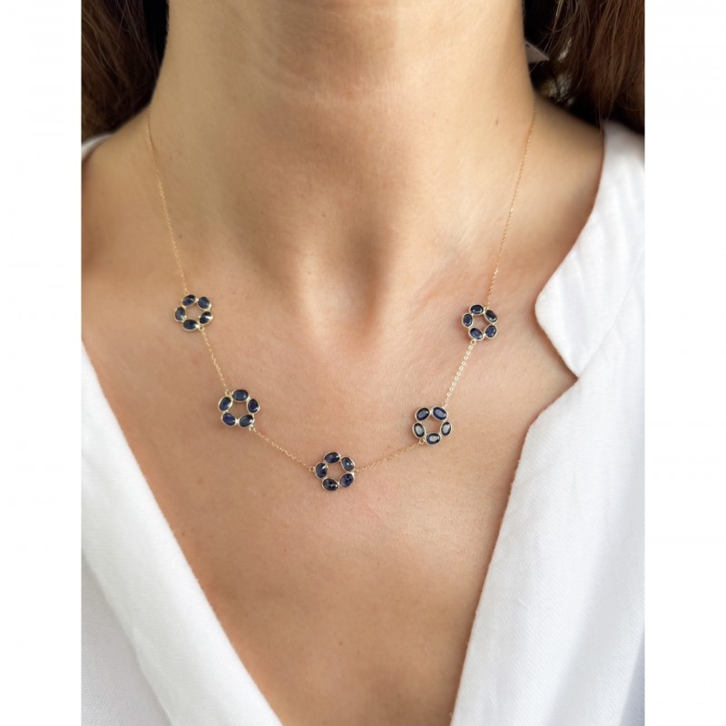 This delicate necklace crafted from 18-carat gold features a stunning arrangement of sapphire stones, designed to resemble flowers. The floral motif adds a unique charm, making it feel like wearing an elegant flower necklace made of precious stones. Its intricate design is sure to make a statement while offering a sophisticated touch to any outfit.