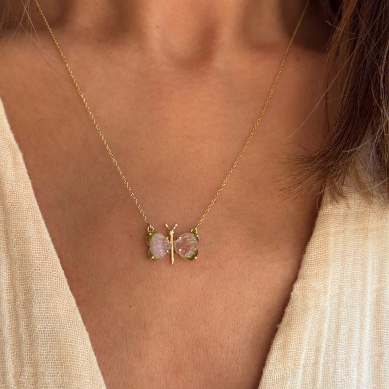 This delicate butterfly necklace made of Turmaline stones and 18-carat gold is indeed a unique piece. The intricate design features wings in enchanting shades of pink and green, showcasing the skilled craftsmanship of talented artisans in Jaipur. Each piece’s detail highlights both the artistry in carving the stones and the metalwork, making it an eye-catching addition to any jewelry collection.
