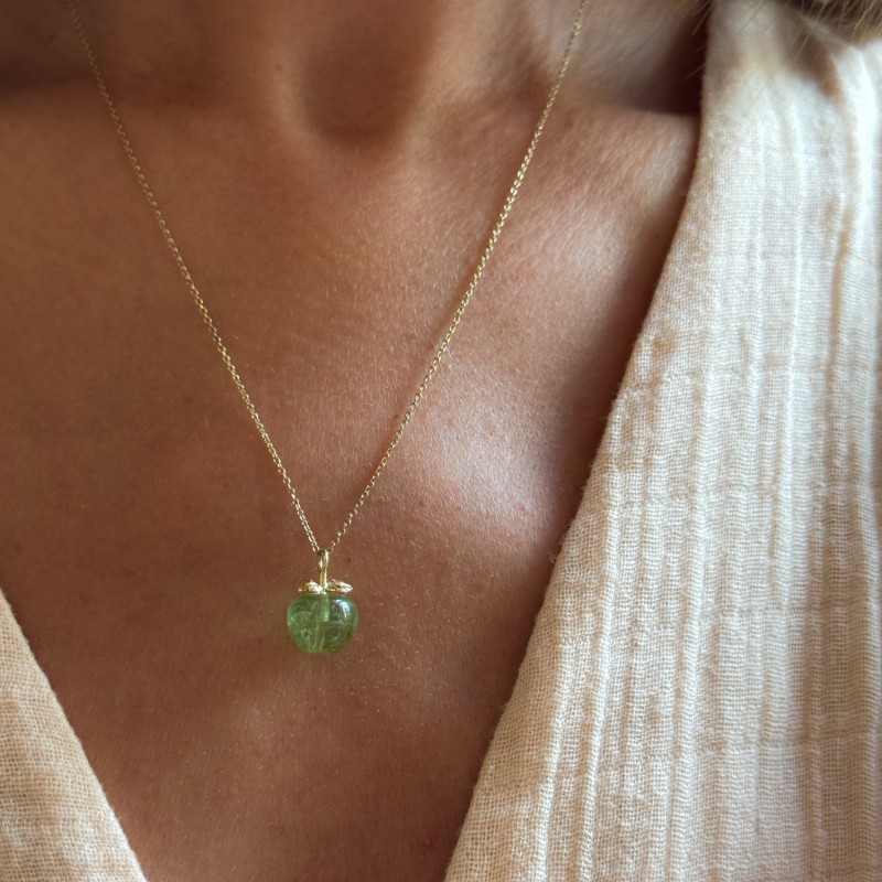 This delicate green apple necklace is beautifully crafted from 18-carat gold and carved green tourmaline. Its unique design, made by skilled artisans in Jaipur, adds a charming and whimsical touch. It truly stands out as a one-of-a-kind piece, perfect for those who appreciate artisanal jewelry.