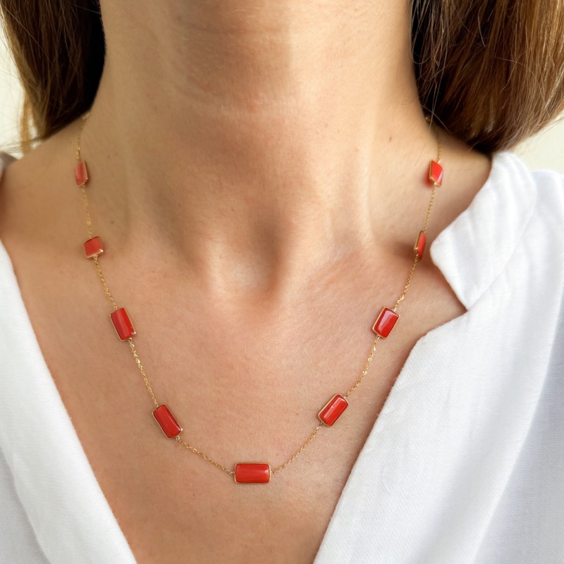 This delicate necklace features 18-carat gold and showcases rectangle coral stones set in a bezel. Its chic and versatile design makes it a perfect accessory for summery outfits, adding a touch of elegance and color. The combination of gold and vibrant coral creates a refreshing look that's suitable for various occasions.