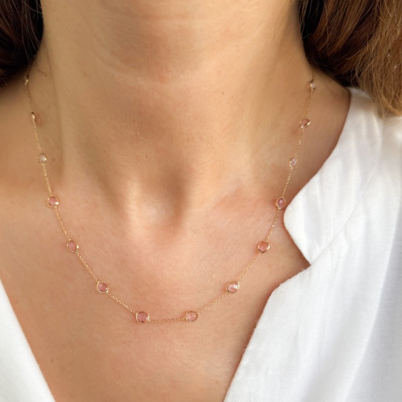 This delicate necklace features 18-carat gold and beautifully faceted tourmaline stones in a bezel setting. Each piece is handcrafted by skilled artisans in Jaipur. The stones exhibit unique shades of light pink creating a versatile accessory that can complement various outfits. The design emphasizes elegance and craftsmanship, making it a lovely choice for any occasion.