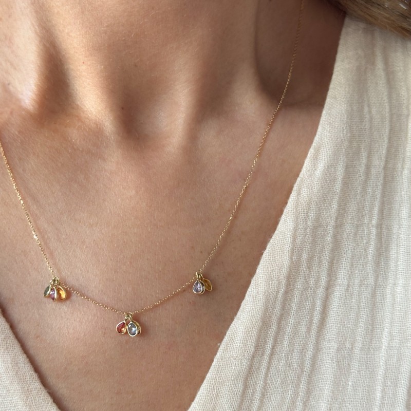 This stunning necklace features 18-carat gold and is beautifully adorned with dangling drops of sapphires in various unique colors. Its handmade design enhances its delicate appeal, making it a versatile piece of jewelry that can complement various outfits effortlessly. The combination of the soft gold chain and the vibrant shades of the sapphires adds a touch of elegance and personality to the necklace.