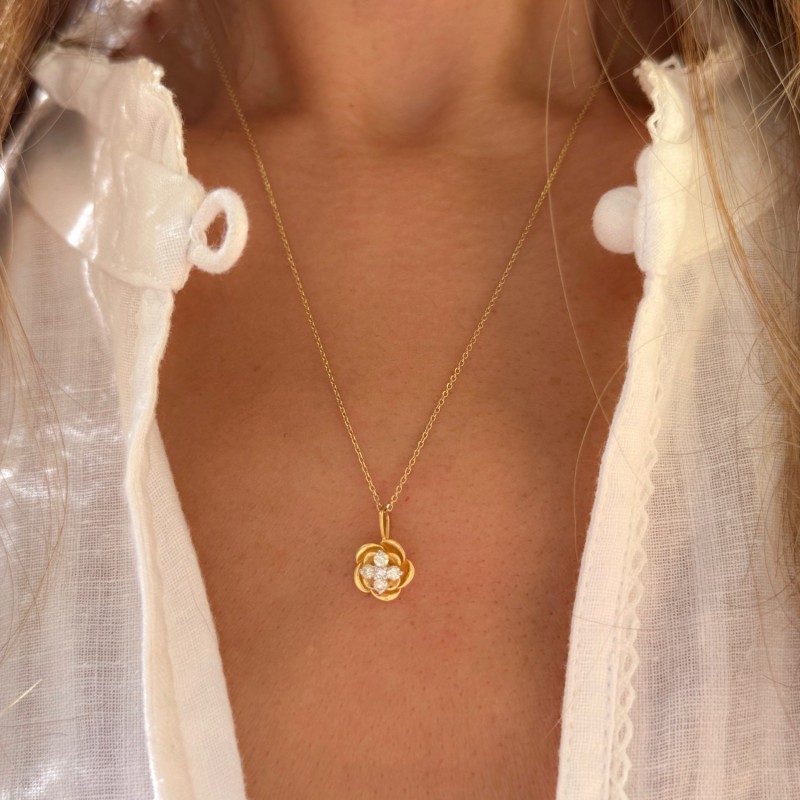 The smooth golden petals curl gracefully around the diamonds, giving the piece a soft, romantic silhouette. Versatile and refined, this pendant is perfect for everyday elegance as well as special occasions. It pairs beautifully with both simple gold chains and more elaborate jewelry combinations.
