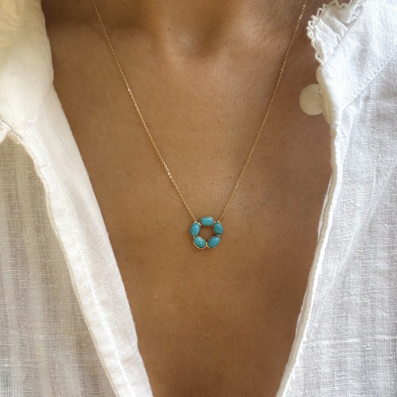 This necklace has a lovely, effortless elegance to it. The 18-carat gold chain is fine and delicate, which makes the turquoise stones stand out beautifully. The pendant itself—five smooth, oval turquoise pieces arranged in a circular motif—feels both modern and timeless. The vibrant blue of the stones contrasts gently with the warm gold, giving it a fresh, sun-kissed look that pairs perfectly with light, airy fabrics like the one shown.