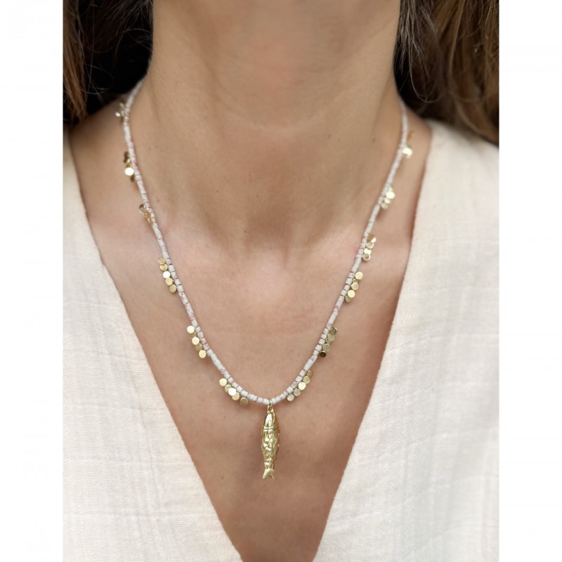 Short necklace adorned with tiny sequins and a fish pendant.