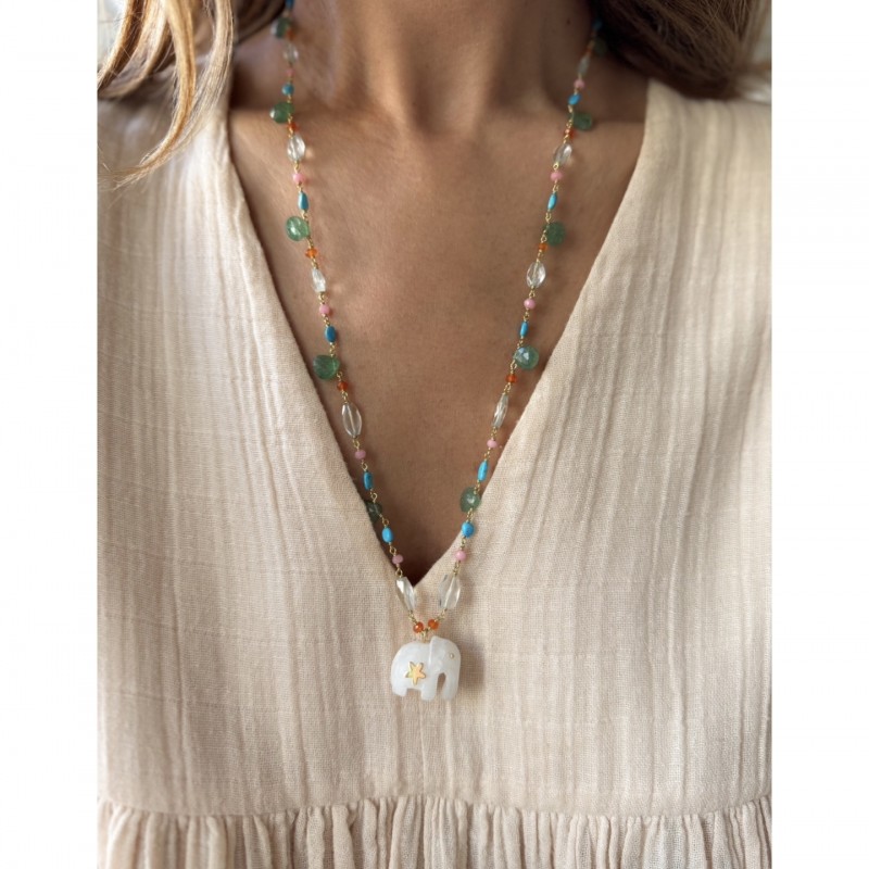 Material: 18 carat gold plated brass. White Agate. Measurement of the elephant pendant: approx. 17 mm x 15 mm. Every single elephant pendant is hand carved by Jaipur artisans. Stones: colourful semi precious stones.