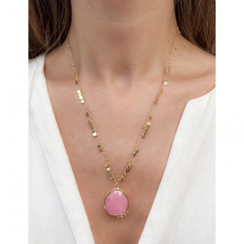 Material: 18 carat gold plated brass. Pink coloured jade stone pendant. Measurement of the pendant: approx. 20 mm.