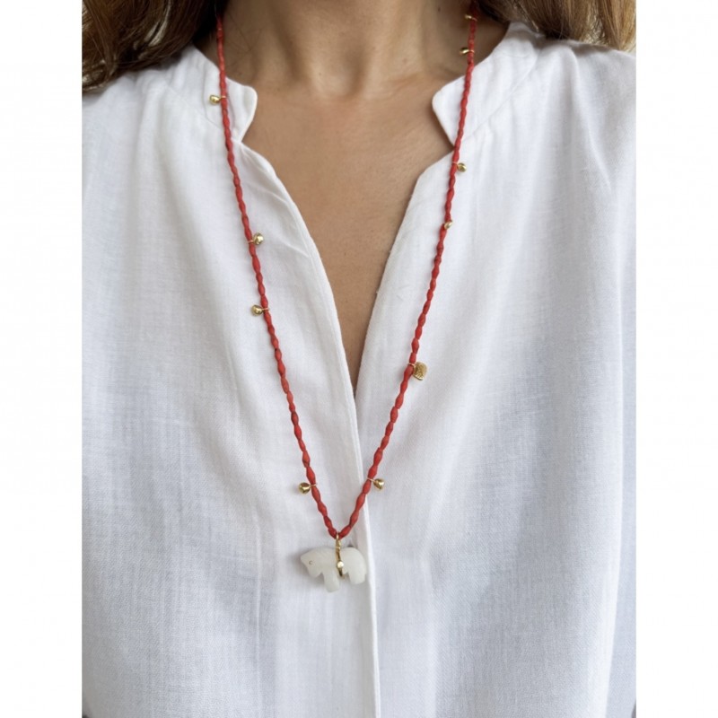 Material: 18 carat gold plated brass. White Agate. Measurement of the horse pendant: approx. 20 mm x 10 mm. Every single horse pendant is hand carved by Jaipur artisans. Stones: Coral color agate beads.