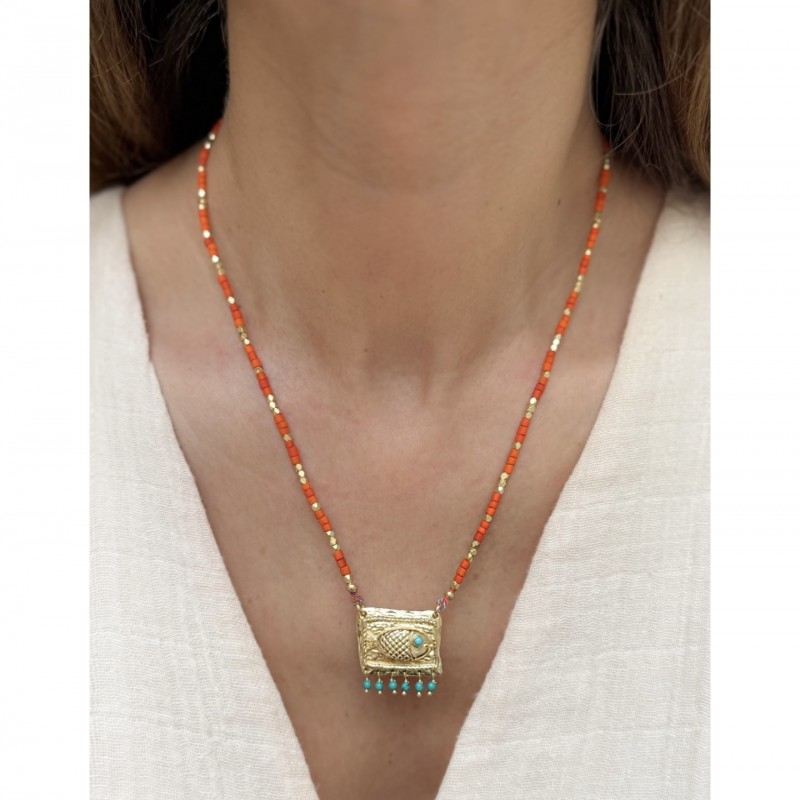 Material: 18 carat gold plated brass. orange and turquoise agate beads.