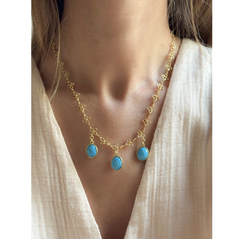 Necklace with small hand made flowers and adorned with oval shaped Howlite turquoise stones.