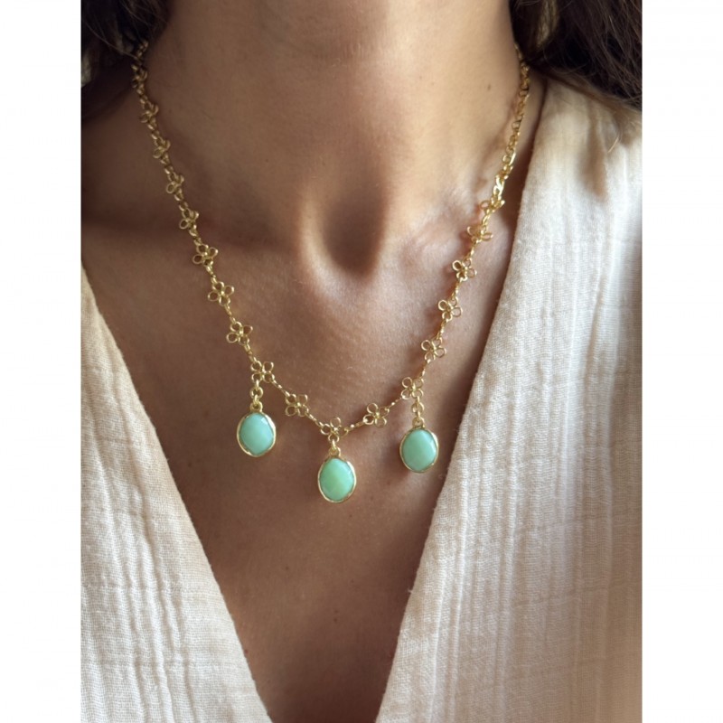 Necklace with small hand made flowers and adorned with oval shaped chrysoprase stones.