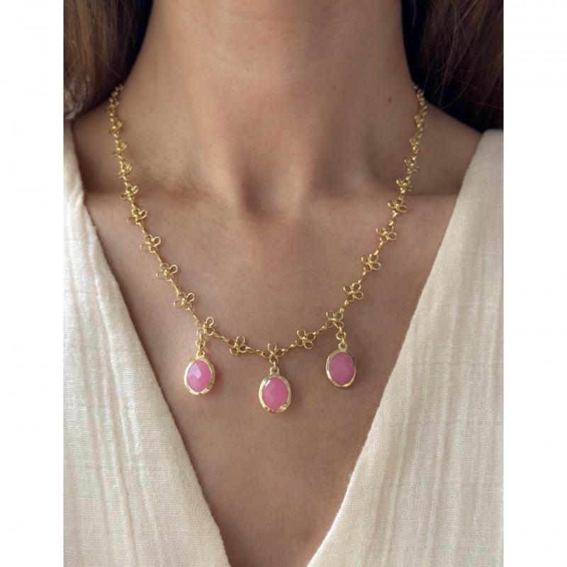 Necklace with small hand made flowers and adorned with oval shaped pink jades.