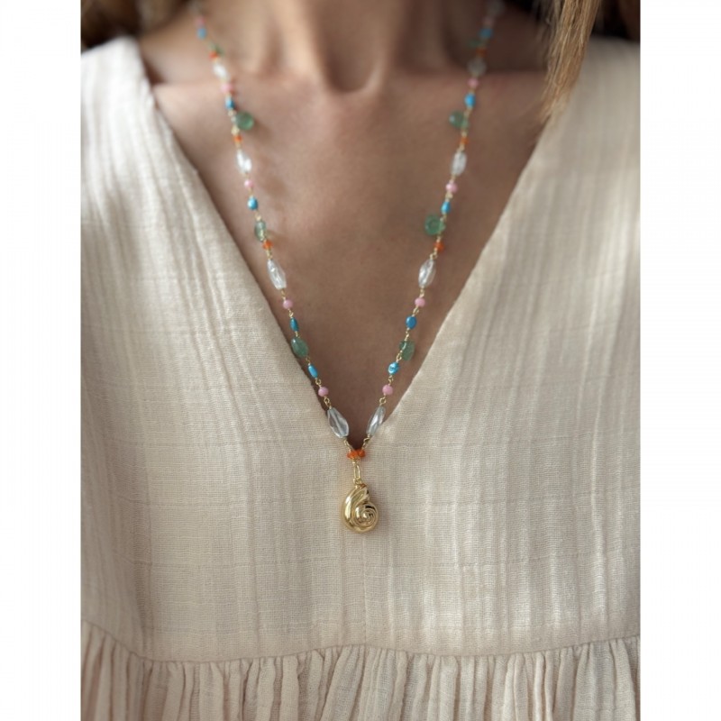 Necklace adorned with a pretty shell pendant.