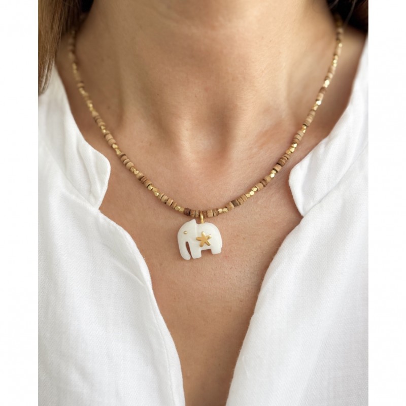 Material: 18 carat gold plated brass. White Agate. Measurement of the elephant pendant: approx. 17 mm x 15 mm. Every single elephant pendant is hand carved by Jaipur artisans. Wood beads.