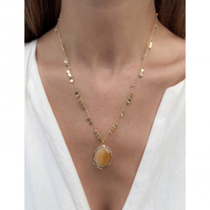 Material: 18 carat gold plated brass. Caramel coloured Jade stone pendant. Measurement of the pendant: approx. 20 mm.