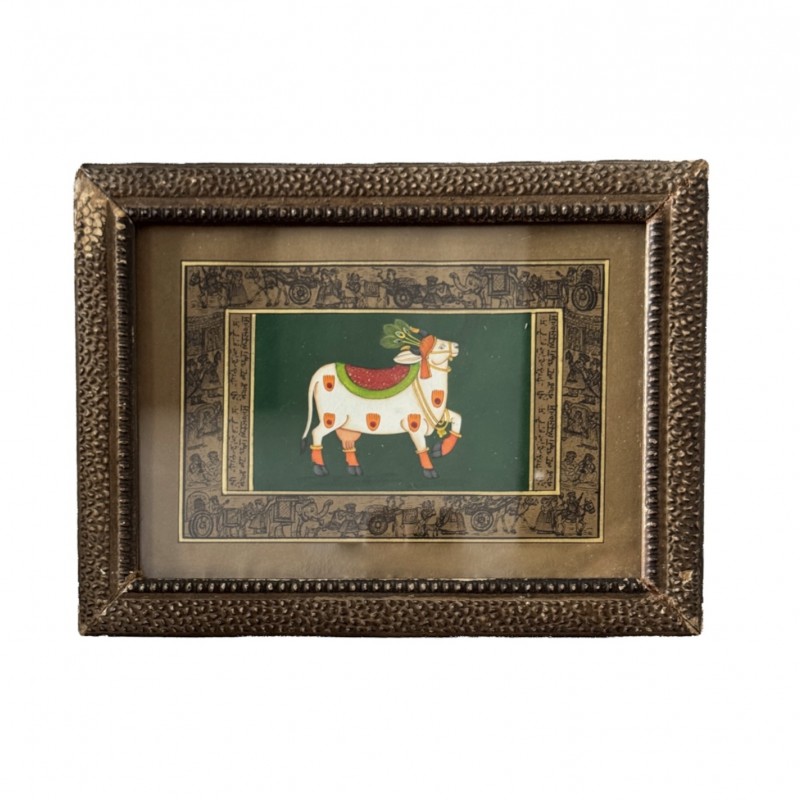 This Indian miniature painting beautifully depicts a holy cow, showcasing the intricate artistry typical of this traditional style. The vibrant colors and detailed patterns reflect the craftsmanship of talented artists in India. Miniature paintings like this one are indeed rare and often carry cultural significance, illustrating the importance of the cow in Indian society. The framing further enhances the artwork, making it a unique piece for display.