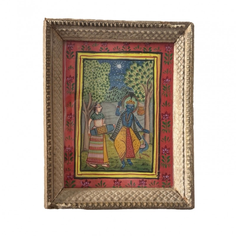 This artwork appears to be a traditional Indian miniature painting featuring Lord Krishna, who is often depicted in various artistic forms. The vibrant colors and intricate details are characteristic of Indian miniature art. It captures cultural and religious narratives, showcasing Krishna in a pastoral setting, likely with a companion. The painting's style may reflect specific regional techniques, such as those from Rajasthan or Mughal traditions. Miniatures like this are celebrated for their craftsmanship and storytelling.