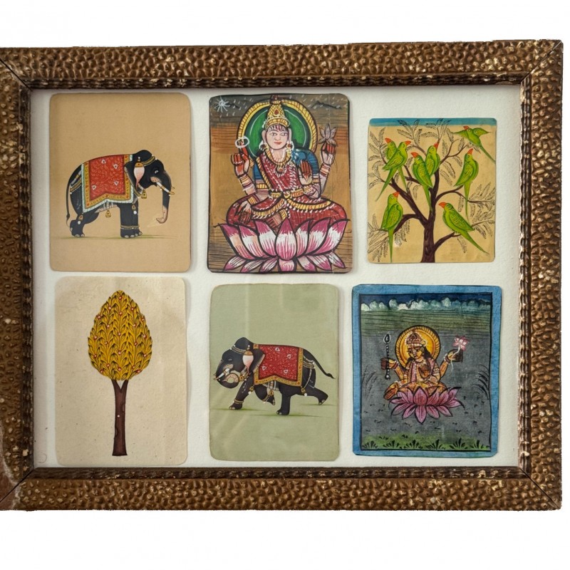 The collage features beautiful Indian miniature paintings that showcase traditional themes such as elephants, the Tree of Life, parrots, and Lakshmi. Each painting is hand-painted, highlighting intricate details and vibrant colors. These artworks are rare and reflect the rich cultural heritage and craftsmanship of Indian art. The frame adds to the overall aesthetic, making it a charming decorative piece