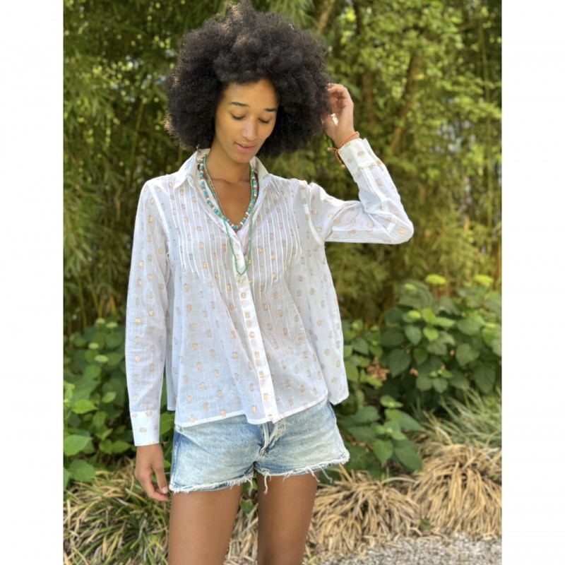 The Sara Lashay light summery shirt in off-white is a fashionable staple for warm weather. Adorned with charming golden dots, this top radiates a playful yet elegant vibe. Crafted from 100% breathable cotton, it offers exceptional comfort and lightness, making it ideal for sunny days. The button-down front adds a touch of sophistication, while its versatile design pairs beautifully with denim shorts in blue or khaki. To complete the look, consider accessorizing with Sara Lashay gold jewelry, enhancing your ensemble with a touch of glam. This shirt is perfect for casual outings or beach days, effortlessly blending style and comfort.