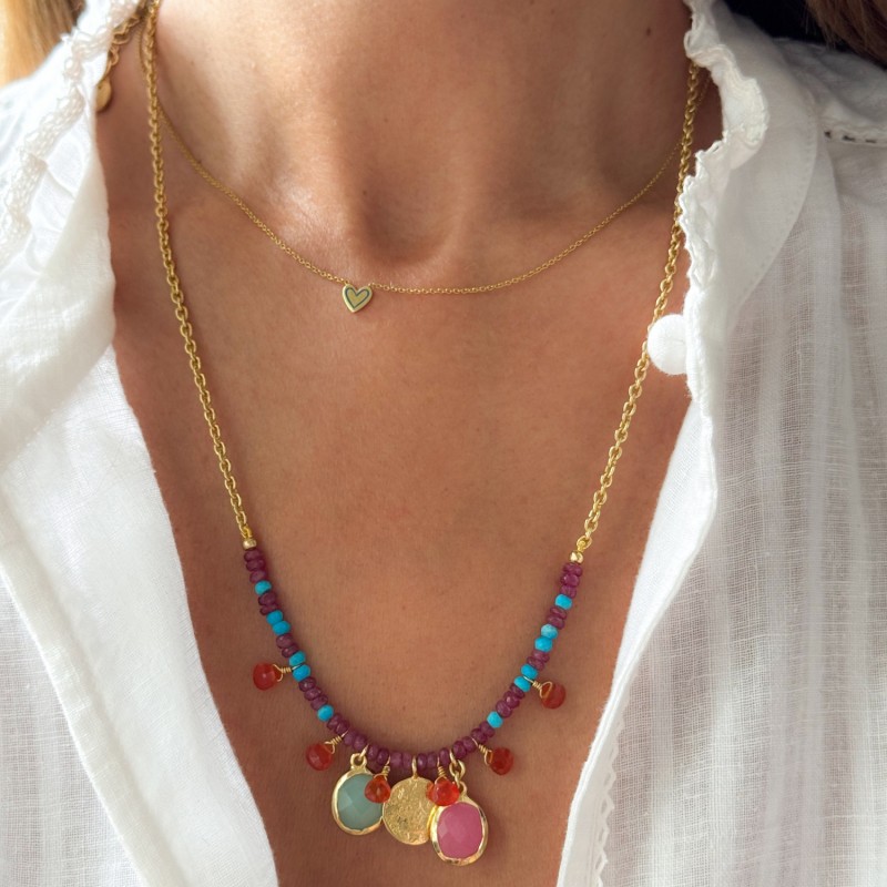 Material: 18 carat gold plated brass. Small oval shaped chrasophrase, pink jade pendants. Carnelian, Arizona turquoise and ruby beads.