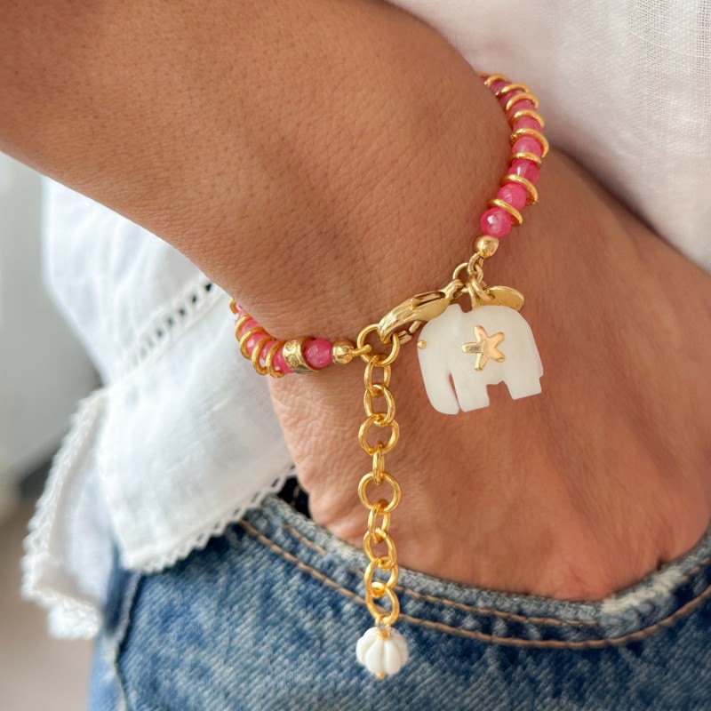 Material: 18 carat gold plated brass. White Agate. Measurement of the elephant pendant: approx. 12 mm x 11 mm. Every single elephant pendant is hand carved by Jaipur artisans. Stone: pink jade beads.