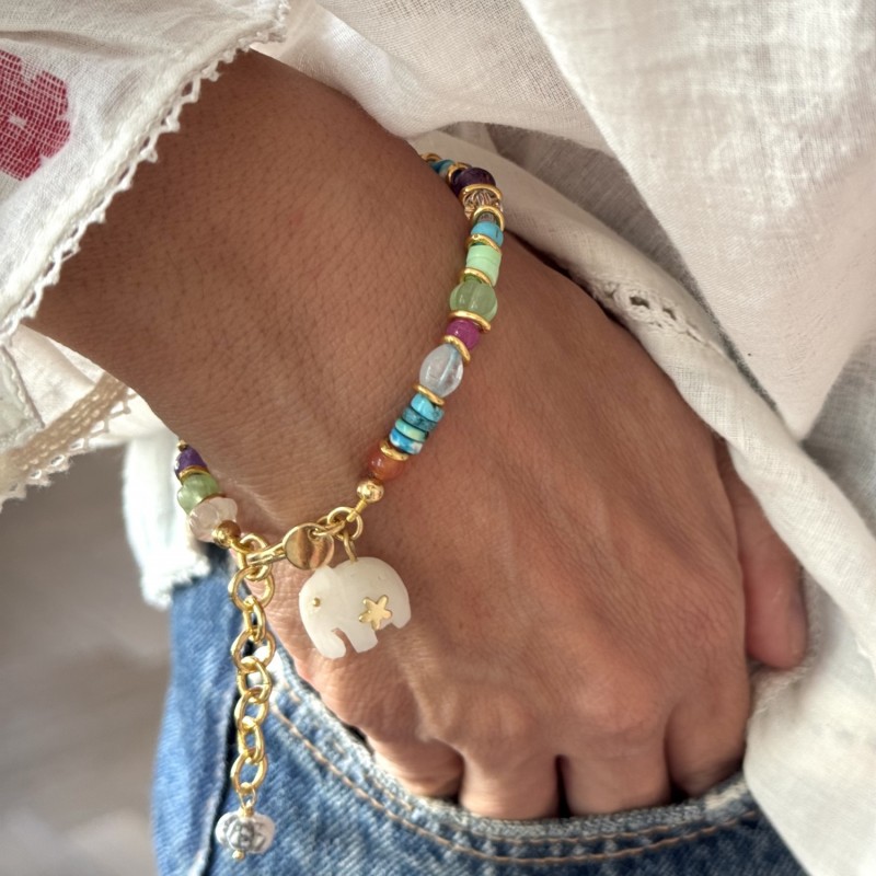 Material: 18 carat gold plated brass. White Agate. Measurement of the elephant pendant: approx. 12 mm x 11 mm. Every single elephant pendant is hand carved by Jaipur artisans. Stone: colorful semi precious stones.