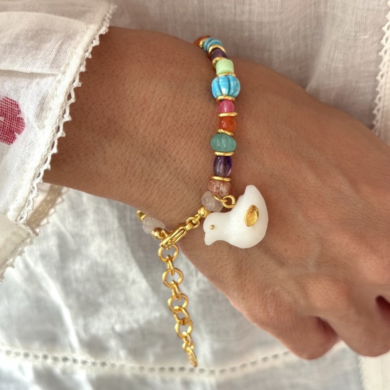 Bracelet adorned with a hand-carved little duck pendant made of white Agate stone. This little duck is carved from both sides.