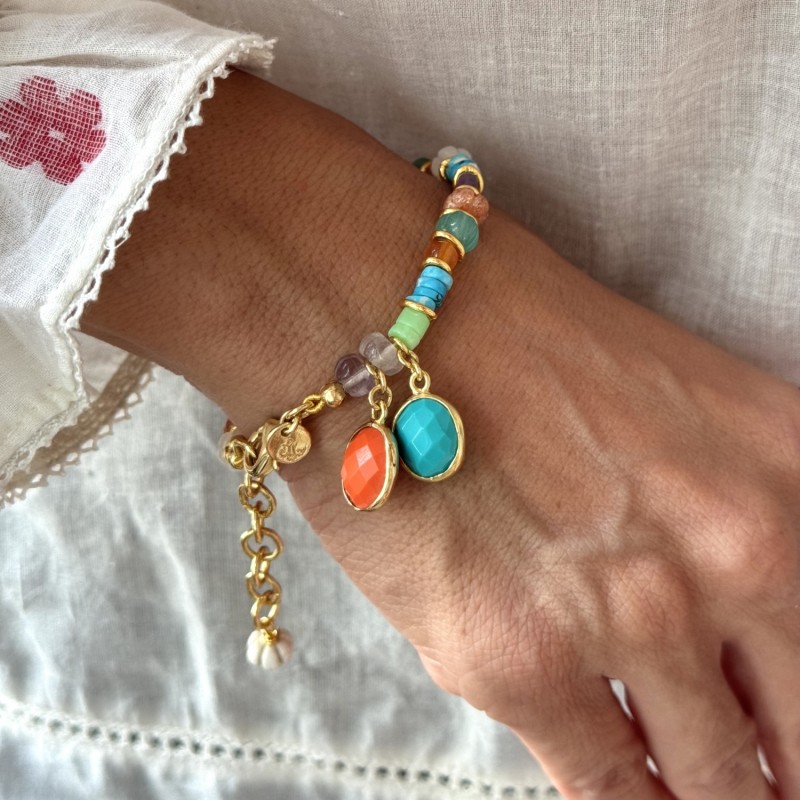 Material: 24 carat gold plated brass. Coral and Turquoise colored agate stones as the pendants. Colorful semi precious stones.