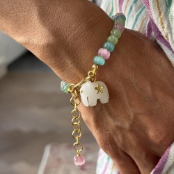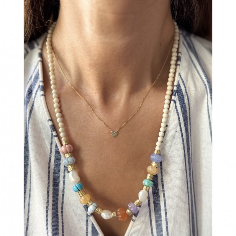 Material: 18 carat gold plated brass. Carved Carnelian, pink and blue opal. howlite turquoise, fresh water pearls, amazonite. cream white fossil beads