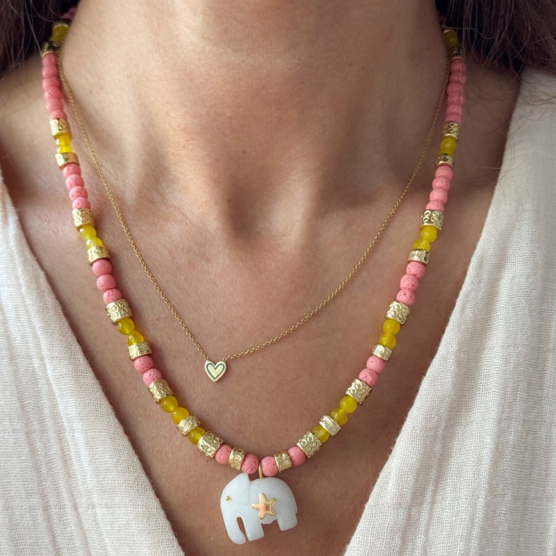 Material: 24 carat gold plated brass. White Agate. Measurement of the elephant pendant: approx. 17 mm x 15 mm. Every single elephant pendant is hand carved by Jaipur artisans. Stones: pastel pink lava beads and yellow jade beads.