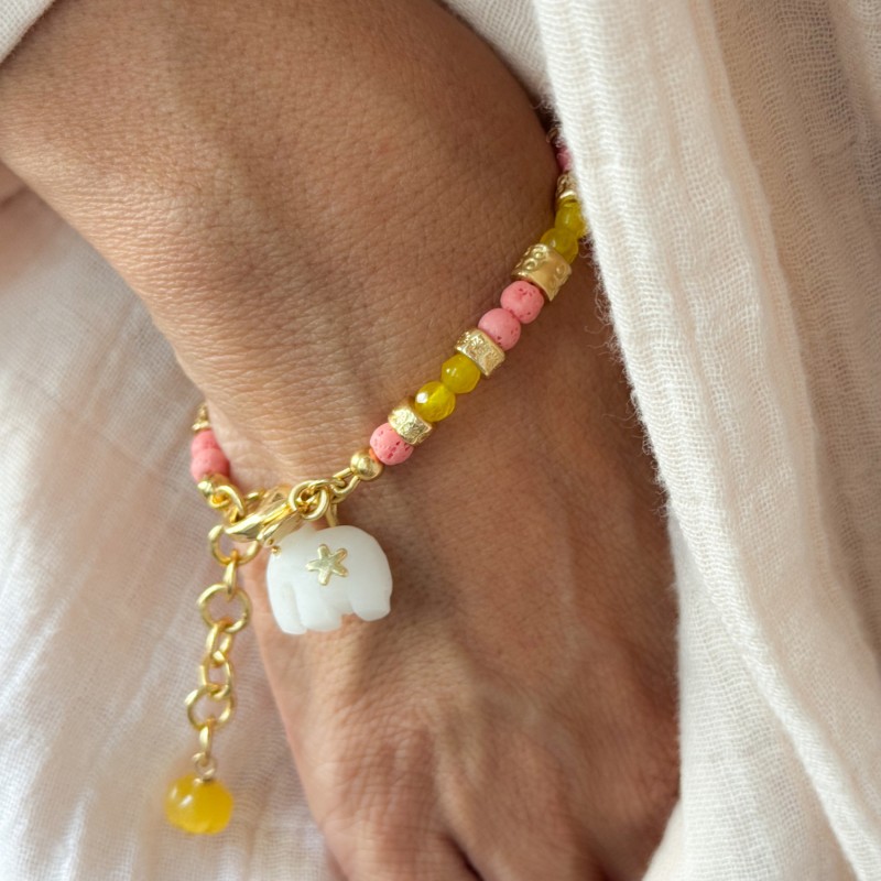 Material: 18 carat gold plated brass. White Agate. Measurement of the elephant pendant: approx. 12 mm x 11 mm. Every single elephant pendant is hand carved by Jaipur artisans. Stone: pastel pink lava beads and yellow jade beads.
