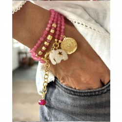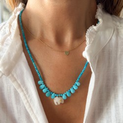 Material: 24 carat gold plated brass. White Agate. Measurement of the duck pendant: approx. 17 mm x 15 mm. Every single duck pendant is hand carved by Jaipur artisans. Stone: Pastel pink lava beads and green jade beads and howlite turquoise pendants.