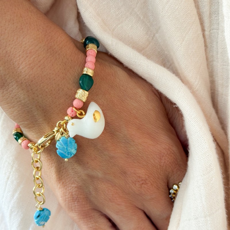 Bracelet adorned with a hand-carved little duck pendant made of white Agate stone. This little duck is carved from both sides.