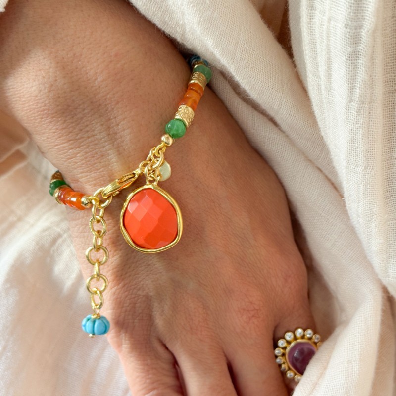 Material: 24 carat gold plated brass. Coral colour agate stone as pendant. Colorful semi precious stones and green glass stones.